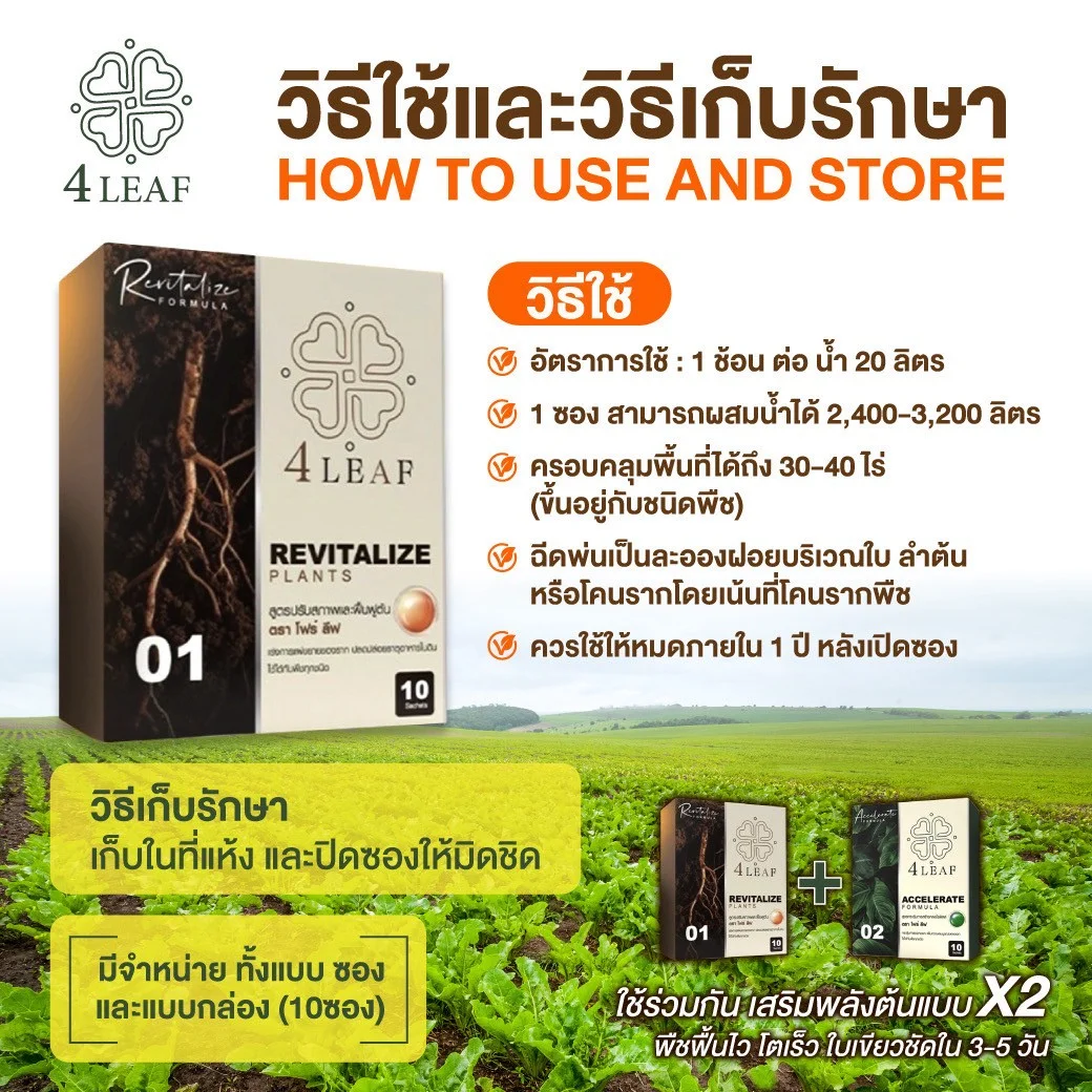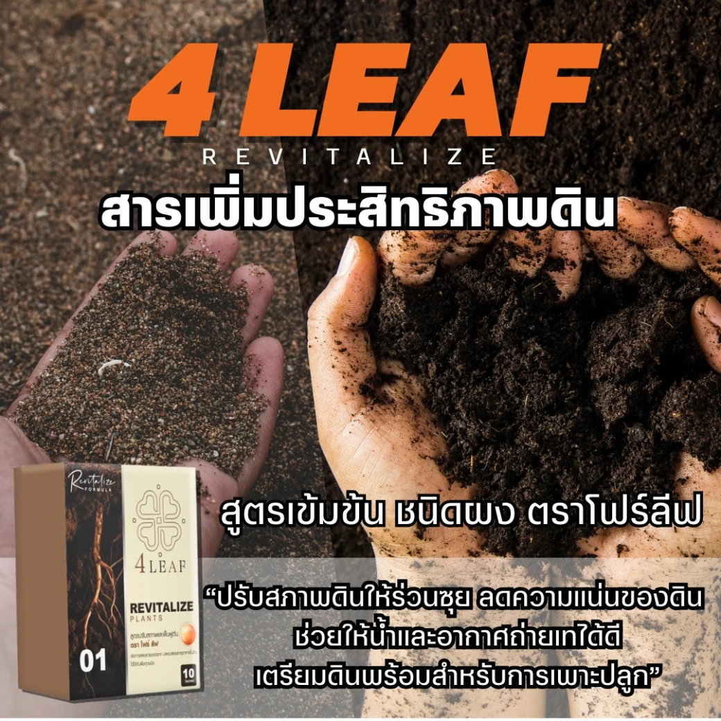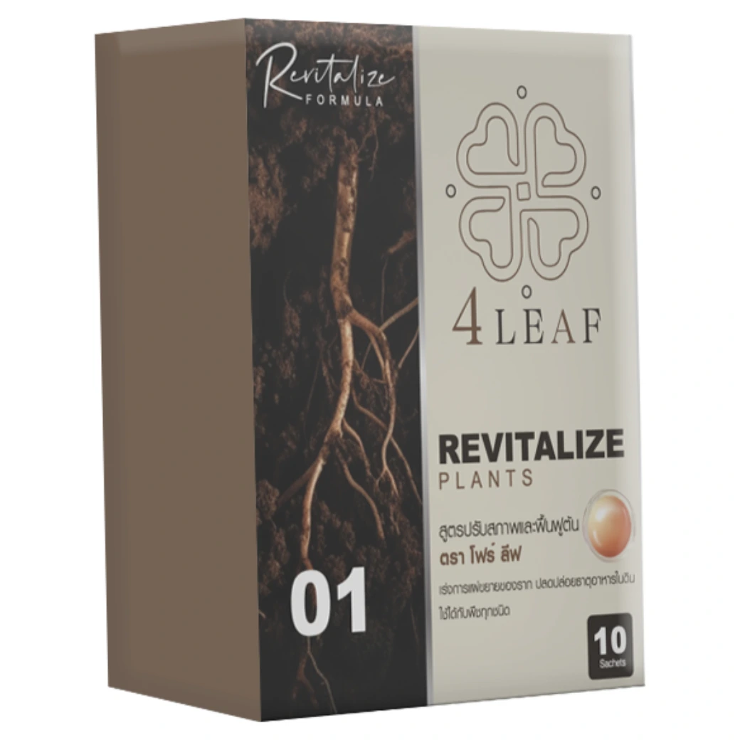 4LEAF โฟร์ลีฟ สูตร Revitalize คือ อาหารเสริมพืชชนิดผง ที่ออกแบบมาเพื่อฟื้นฟูต้นพืชและปรับสภาพดินอย่างมีประสิทธิภาพ เหมาะสำหรับใช้ในช่วงเริ่มต้นของการเพาะปลูก หรือหลังการเก็บเกี่ยว โดยเน้นการเร่งการแตกรากและการแผ่ขยายของระบบราก ช่วยให้พืชสามารถดูดซึมแร่ธาตุและปุ๋ยได้ดีขึ้น เสริมสร้างการเจริญเติบโตอย่างรวดเร็ว เพิ่มความแข็งแรงของต้น ใบ ดอก และผล อีกทั้งยังช่วยปรับโครงสร้างของดิน เพิ่มอินทรียวัตถุ และปลดปล่อยธาตุอาหารในดินให้พร้อมใช้งาน พืชสามารถตอบสนองได้ดีและให้ผลผลิตที่มีคุณภาพมากยิ่งขึ้น เหมาะกับพืชทุกชนิด ทั้งผัก ผลไม้ พืชไร่ และพืชเศรษฐกิจ