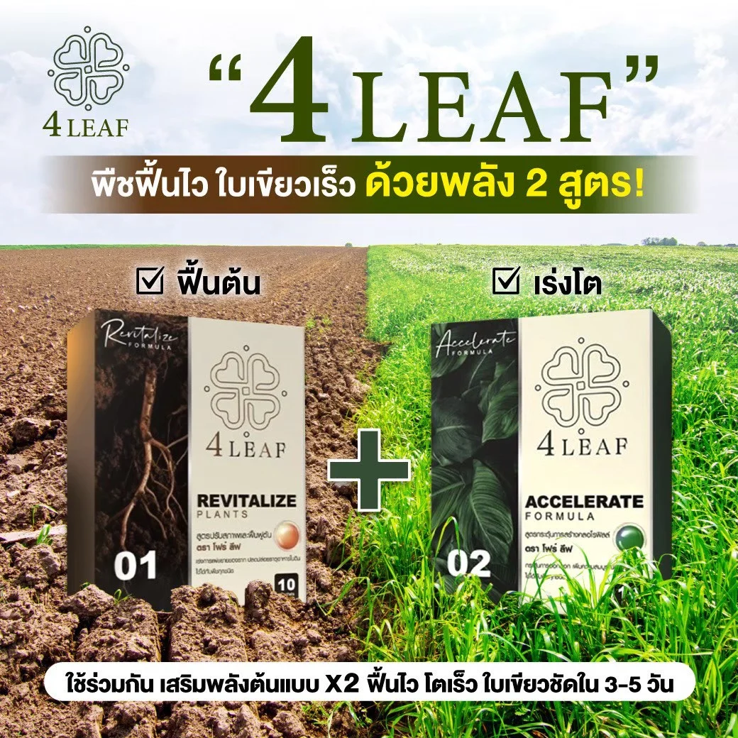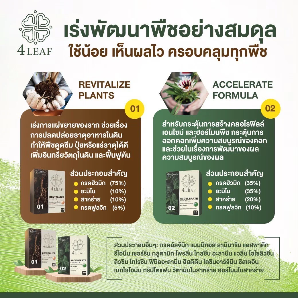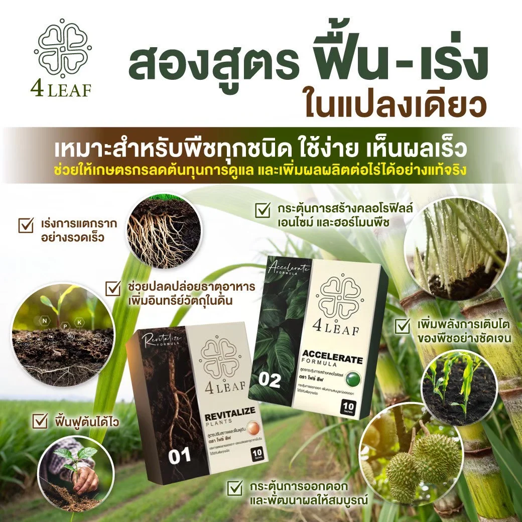 4LEAF โฟร์ลีฟ สูตร Revitalize คือ อาหารเสริมพืชชนิดผง ที่ออกแบบมาเพื่อฟื้นฟูต้นพืชและปรับสภาพดินอย่างมีประสิทธิภาพ เหมาะสำหรับใช้ในช่วงเริ่มต้นของการเพาะปลูก หรือหลังการเก็บเกี่ยว โดยเน้นการเร่งการแตกรากและการแผ่ขยายของระบบราก ช่วยให้พืชสามารถดูดซึมแร่ธาตุและปุ๋ยได้ดีขึ้น เสริมสร้างการเจริญเติบโตอย่างรวดเร็ว เพิ่มความแข็งแรงของต้น ใบ ดอก และผล อีกทั้งยังช่วยปรับโครงสร้างของดิน เพิ่มอินทรียวัตถุ และปลดปล่อยธาตุอาหารในดินให้พร้อมใช้งาน พืชสามารถตอบสนองได้ดีและให้ผลผลิตที่มีคุณภาพมากยิ่งขึ้น เหมาะกับพืชทุกชนิด ทั้งผัก ผลไม้ พืชไร่ และพืชเศรษฐกิจ